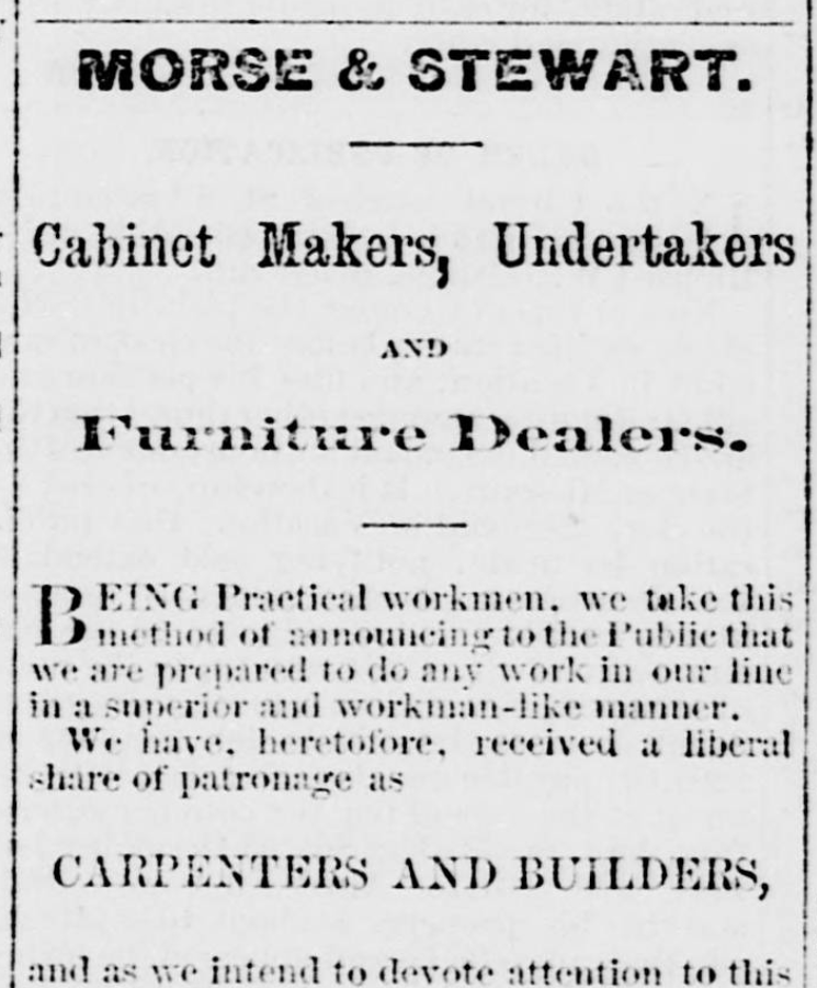 - Clipping of “Morse & Stewart, Cabinet Makers, Undertakers, and Furniture Dealers” advertisement, The Osceola Herald (Osceola, Missouri), 5 Sep 1866, p. 3.