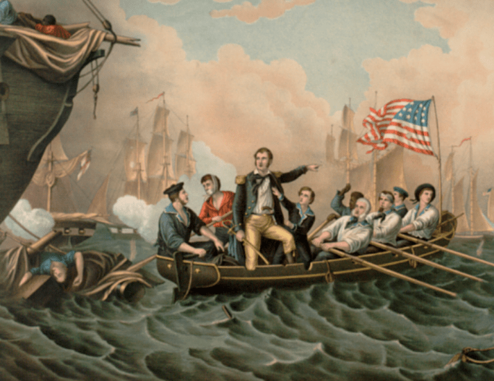 - Crop from “Perry’s Victory at Lake Erie,” Harry T. Peters “America on Stone” Lithography Collection, Chicago, Illinois, Smithsonian Open Access, https://www.si.edu/object/perrys-victory-lake-erie:nmah_325527.