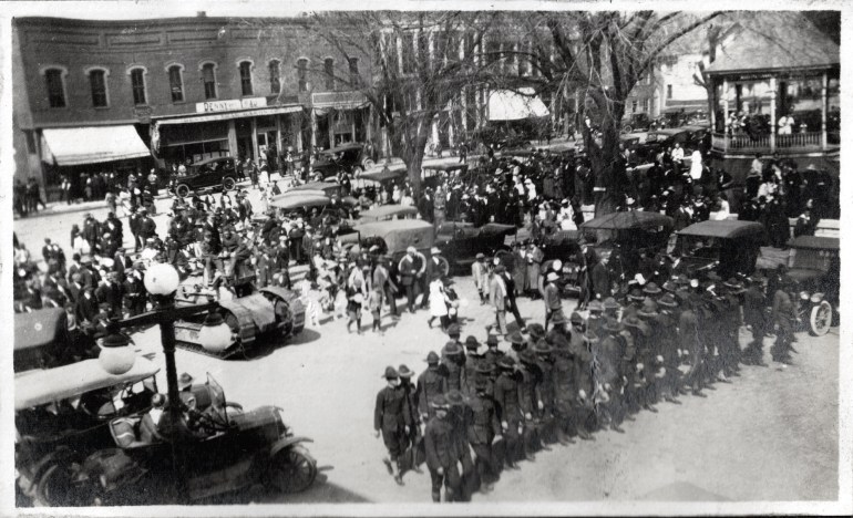 World War I Liberty Bond Rally, Fayette, MO, 1919. Tank and soldier demonstration (possibly the Central College Student Army Training Corps). Denny and Trau Hardware store across the street.