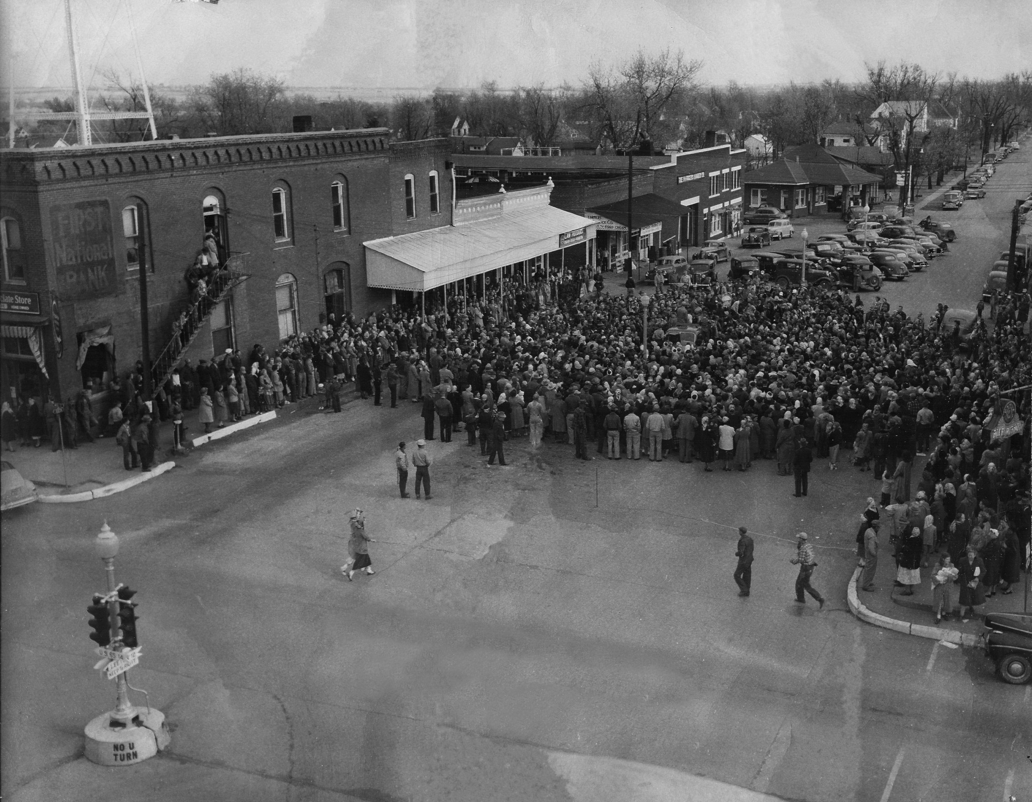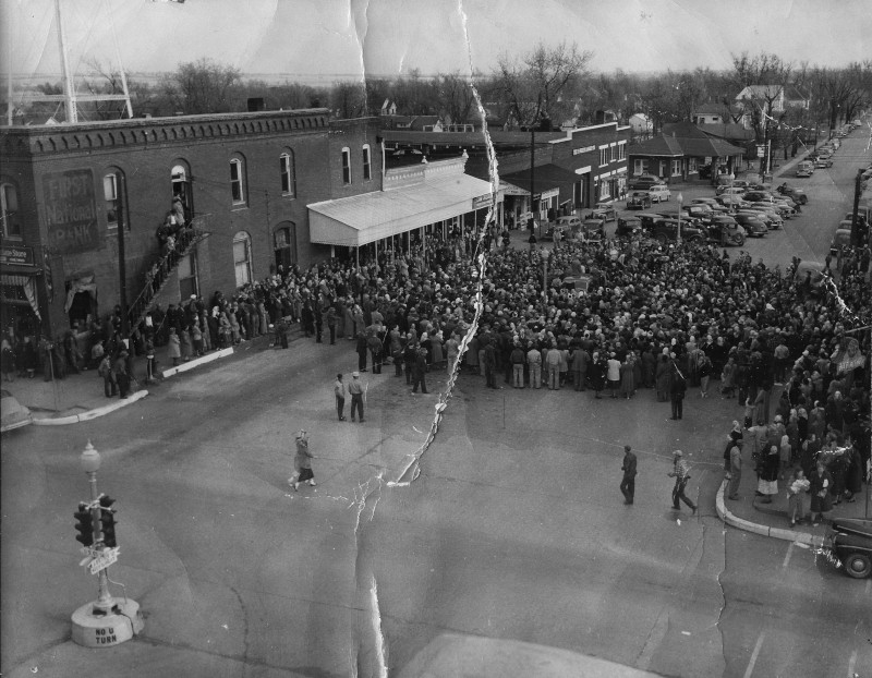 The scene is Windsor, Missouri crossroads, probably a turkey or ham giveaway, latter 1940’s. Buildings from left to right are the Western Auto, Law Produce (white awning), Farmer’s Produce (dark awning), R. H. Rodger’s Lumber, Mobile Gas Station.
