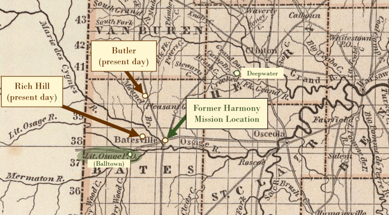 The village of commonly referred to as Balltown or Little Osage was located on the Osage River on the western edge of Vernon County, south of present-day Rich Hill. It was settled in the 1830’s by associates and relatives of the nearby Harmony Mission.