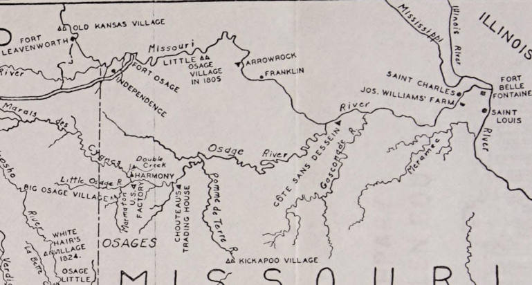 During the period of Williams’ boyhood, St. Louis was the center of the fur trade and the distributing point for such trading and trapping as went on west of the Mississippi. Important in the fur trade were the French voyageurs, with their keel boats and barges going up and down the river, within sight of the Williams home. The coureurs de bois traveled over the old Trace, past the Williams cabin, going into trapping country and returning to St. Louis laden with their packs of furs. All this became part of young Bill Williams’ life. He grew up, from his first remembrance, in the atmosphere of that trade and early began to realize its importance. His father, however, never seemed to have identified himself with the trade, but occupied himself with farming, stock-raising, trading, sugar-making in season, and buying and selling real estate when the opportunity arose.